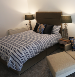 The spacious Bedroom has a king size bed provided with custom made luxury headboard, wardrobe, mirror and bedside cabinets. There is a study table , swivel chair and light. The front of the bedroom has a glass floor which is a beautiful design that allows light through from the downstairs and visa versa. The bedrooms are very spacious over 25 sqr meters.